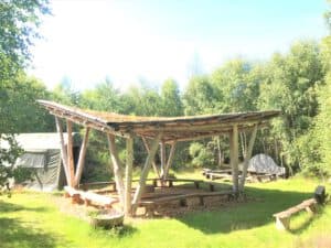 Wir werden den Campingplatz plus großzügigem Woodland Shelter und Küchenzelt (siehe Foto), Komposttoiletten und Kaltwasserdusche, ganz für uns haben. Warme Duschen in der nahen Gemeinschaft stehen uns an bestimmten Tagen zur Verfügung.